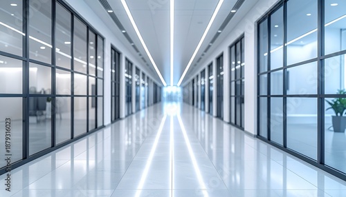 Modern Office Hallway with Glass Walls and Bright Lighting.