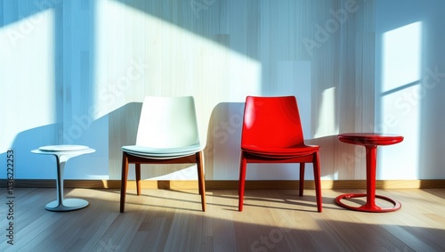 Modern office interior, vibrant red chairs, sleek white table, minimalist design, sunlight casting shadows, polished floor, contemporary workspace, bright and airy, geometric furniture, corporate meet