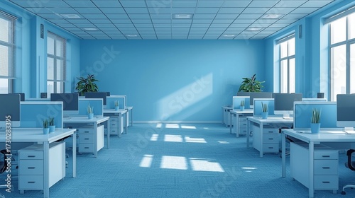 Modern office interior with desks, computers, chairs and bright natural lighting, contemporary workspace design for productivity, professional environment, and corporate office inspiration