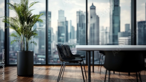Modern Office Interior with Urban Skyline View and Green Plant Decoration Amidst Cityscape