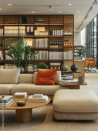 Modern office lounge Beige sectional sofa, ottoman, wooden coffee table, and stylish bookshelf filled with books and files. Neutral color palette, natural light.