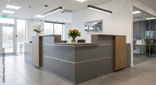 reception, office, modern, minimalist, contemporary, light, grey, brown, wood, cabinet, desk, corner, flower, bouquet, orange, clean, bright, glasses, wall, view, interior, design, functional, space, elegant, professional, neutral, simple, efficient, fresh, commercial, business, receptionist, work, decor, tile, floor, lighting, plant, minimalistic, architecture
