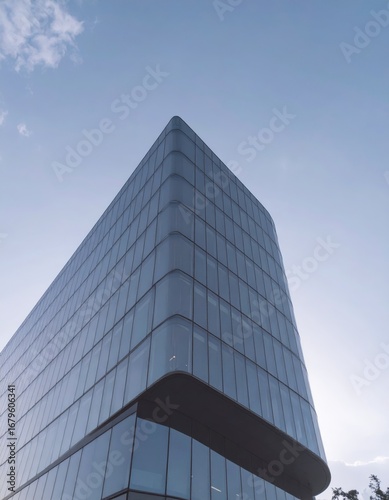 Modern office skyscraper building exterior against blue sky