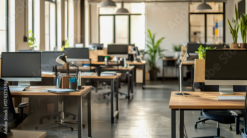 Modern office workspace featuring elegant desks, computers, plants, and bright sunlight enhancing the productive work environment