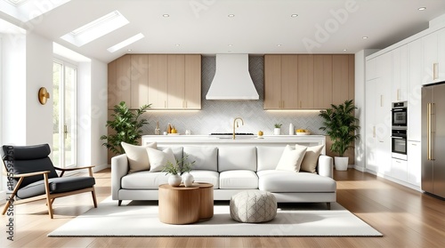 Modern Open-Plan Kitchen and Living Room with Skylights, White and Beige Color Palette, and Comfortable Seating