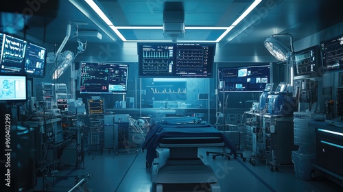Modern operating room filled with advanced medical equipment and monitors, prepared for surgery, showcasing a cutting-edge healthcare environment..
