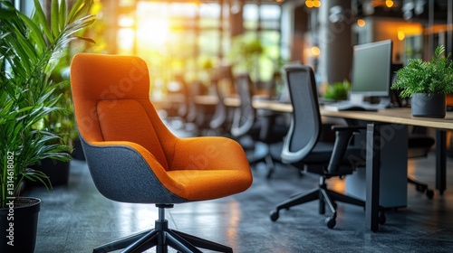 office, chair, modern, workspace, orange, design, furniture, interior, desk, computer, comfortable, stylish, contemporary, professional, business, corporate, elegant, ergonomic, technology, bright, sunlight, plant, decor, setting, environment, room, building, workplace, style, trendy, innovative, new, clean, minimalist, aesthetic, vibrant
