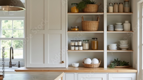 modern pantry in countryside kitchen, custom wooden shelving with jars, baskets and linens, soft neutral palette, functional and beautiful styling, natural light entering from side, copy space on shel