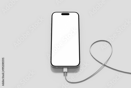 modern phone in wire cable charging blank white screen mockup isolated 3d render top view