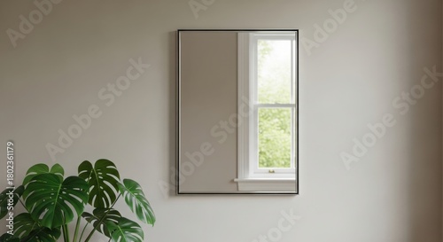 mirror, wall, rectangular, modern, window, plant, monstera, green, beige, interior, home, decor, design, light, bright, clean, simple, minimalist, aesthetic, elegance, contemporary, living, room, background, space, empty, neutral, natural, indoor, house, apartment, residential, style, furniture, object, surface, texture