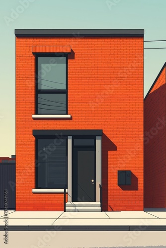house, building, facades, red, brick, architecture, modern, urban, design, contemporary, door, window, exterior, street, minimalism, visual, structure, sunlight, colours, geometric, residential, clean, line, shadow, perspective, artwork, illustration, symmetry, simplicity, space, entrance, pathway, neighbourhood, city, home, brickwork, decoration, style, lighting, environment, color palette, urban scene, community