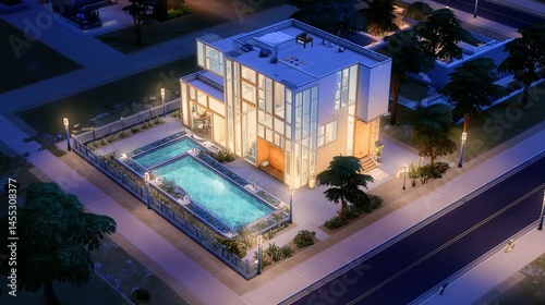 night, modern, house, architecture, residential, design, swimming, pool, exterior, city, urban, suburban, landscape, illuminated, light, building, home, property, complex, roomy, upscale, contemporary, structure, facades, view, aerial, top, pool, garden, tree, detail, illumination, residence, evening, concrete, glasses, lighting, large, luxurious