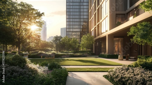 building, apartment, residential, skyscraper, modern, architecture, contemporary, city, urban, garden, landscaping, lawn, pathway, tree, plant, flower, shrub, sun, sunlight, sunrise, sunset, exterior, design, luxury, elegant, tranquil, peaceful, serene, green, nature, environment, property, real estate, home, house, development, construction, view, scene, image, photo, park, piazza, courtyard, facades, glasses, stone