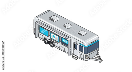 recreational vehicles, trailer, camper, recreation, leisure, travel, transportation, vehicle, modern, flat, isometric, exterior, window, roof, tire, wheel, step, door, ventilated, air, conditioner, light, structure, mobile, home, outdoors, vacation, holiday, road, journey, adventure, minimal, design, architecture, building, metal, blue, white