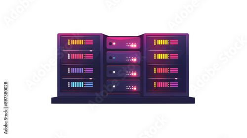 Modern server rack with colorful LED lights, showcasing technology and data storage in a vibrant, digital environment.