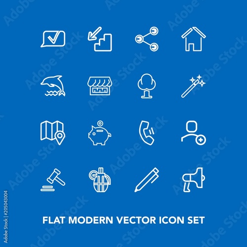 Modern, simple vector icon set on blue background with bank, telephone, coin, military, loudspeaker, money, social, law, upstairs, weapon, sign, up, announcement, user, loud, cell, technology icons