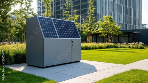 Modern Solar Energy Unit in Urban Landscape with Lush Green Grass and Contemporary Architecture Surrounding It