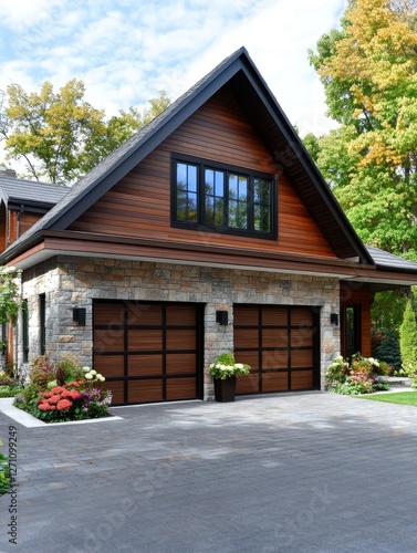 Modern Stone and Wood Double Garage Design - Contemporary double garage showcasing modern stone and wood architecture, emphasizing clean lines, natural materials, and landscaping. Represents elegance