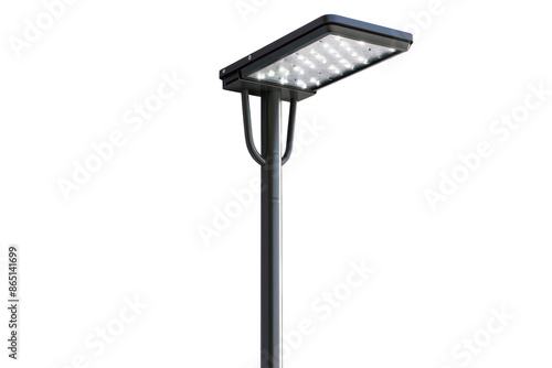 Modern street lamp post with a rectangular LED light fixture. Isolated on a black background. Perfect for urban design and infrastructure projects.