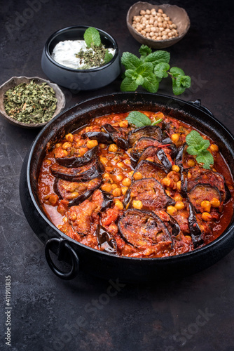 Modern style slow cooked Lebanese vegetarian eggplant stew maghmour served with chickpeas as close-up in a design pot
