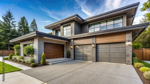 Modern suburban home exterior with Clean concrete driveway leading to pair of elegant steel garage doors with windows under a sloping roof overhang.