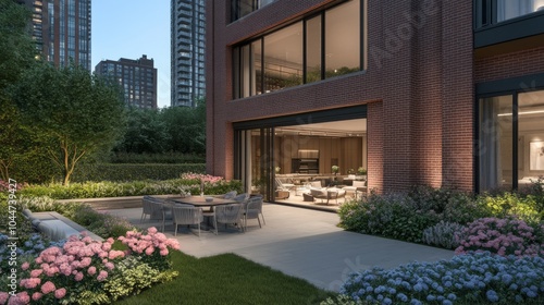 urban, development, architecture, garden, exterior, design, patio, seating, flower, tree, building, landscape, modern, lighting, contemporary, home, relaxation, ambience, luxury, space, greenery, pathway, window, city, living, yard, brick, nature, leisure, peaceful, residential, environment, view, style, foliage, lawn, flowerbed, area, furniture, terrace, city landscape, soft, evening, serene, clean