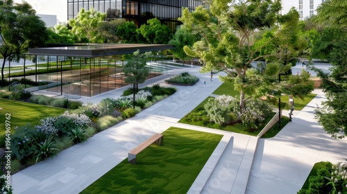 Modern Urban Park with Green Spaces, Trees, Paths, and a Pavilion Surrounded by Contemporary Architecture and Vibrant Landscaping