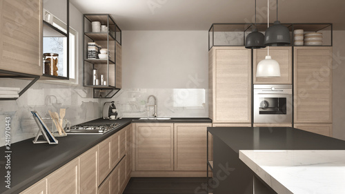 Modern white and gray kitchen with wooden details and parquet floor, modern pendant lamps, minimalistic interior design concept idea, island with stools and accessories