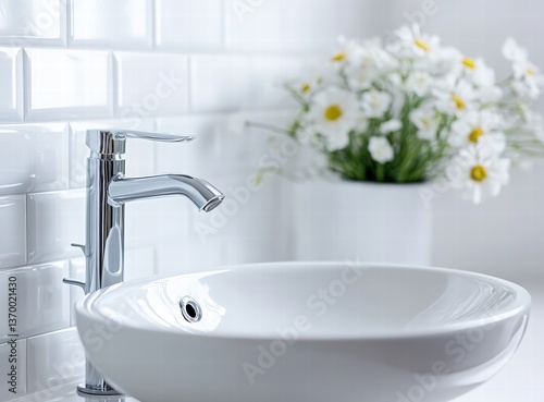 modern white ceramic sink with flowers and toothbrushes in minimalist bathroom interior
