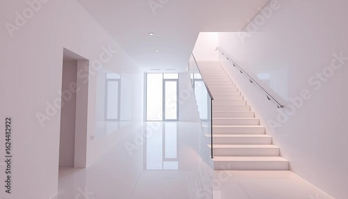 Modern white hallway with sleek staircase ascending to glass door, structure, hallway