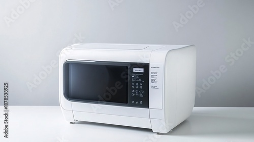 Modern White Microwave Oven on White Table in Minimalist Kitchen Setting