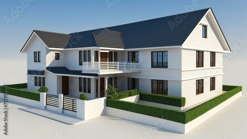 house, home, residential, modern, architecture, building, property, real estate, white, roof, grey, two-story, balcony, fence, hedge, green, exterior, design, contemporary, new, family, suburban, luxury, dwelling, construction, render, three-dimensional, isolated, background, clear, sky, sunny, bright, clean, elegant, estate, housing, structure, private