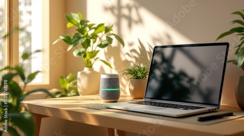 Modern Workspace Laptop, Smart Speaker, Plants on Wooden Desk with Sunlight and Bright Interior