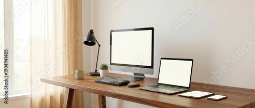 Modern workspace setup featuring desktop and laptop computers in a bright room with natural light ideal for productivity minimalist design clean aesthetic home office environment