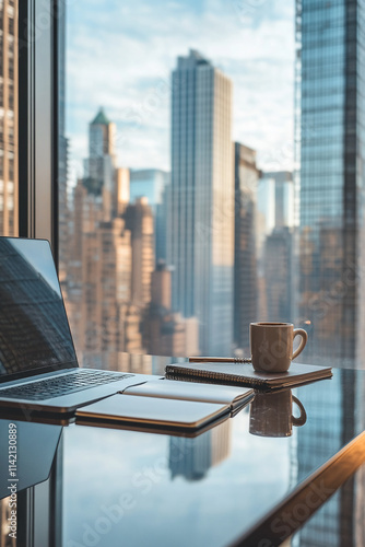 desk, laptop, notebook, coffee cup, city skyline, morning light, urban view, workspace, professionalism, skyscraper, productivity, coffee break, daylight, architecture, business, calmness, writing, planning, technology, lifestyle, calming, cosy, organisation, clear sky, sharpened, metropolitan, reflections, contemporary, simplicity, efficiency