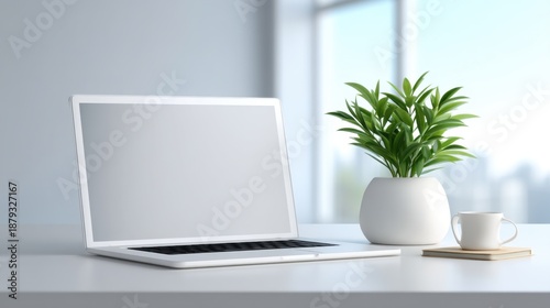 Modern Workspace with Laptop, Potted Plant, Coffee Cup, and Notepad on Minimalist Desk in Bright Room with Natural Light Streaming Through Window