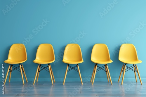 Modern yellow chairs against a blue wall in a minimalist interior