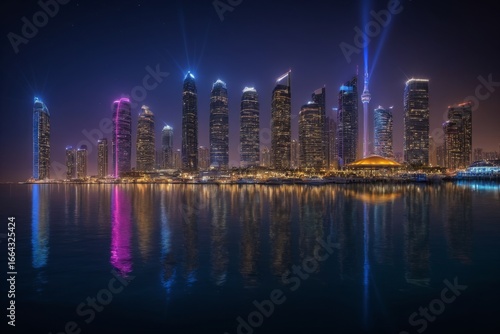 Moderne Skyline bei Nacht mit bunten Lichtern und reflektierendem Wasser