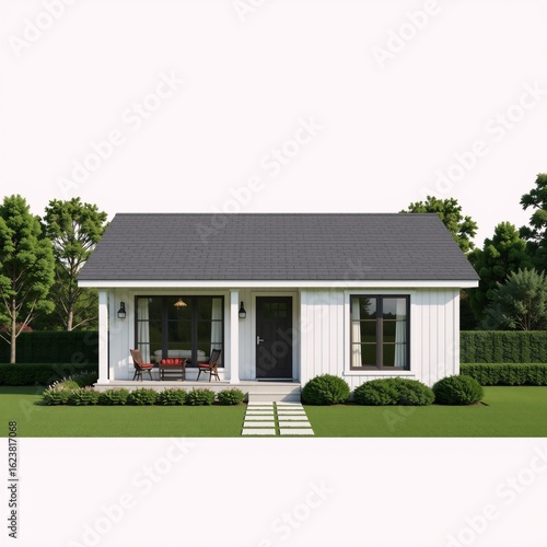 Modern-style small cottage house on verdant grass with surrounding nature and white backdrop Isolated Clipping Path 3D Render
