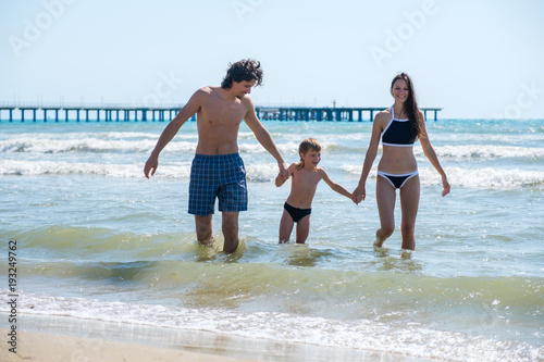 Mom, dad and son walking in the sea on warm sunny day. Holding hands together.