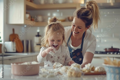 family, daughter, kitchen, teaching, children, bonding, cooking, mother, development, baking, food, help, egg, egg, cook, instructing, flour, table