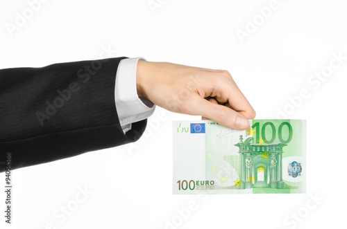 Money and business topic: hand in a black suit holding a banknote 100 euro isolated on a white background in studio