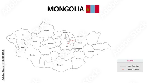 Mongolia Map. State and district map of Mongolia. Administrative map of Mongolia with states and boundaries in white color.