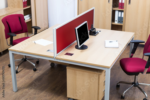 armchair, chair, office, computer, furniture, seat, monitor, screen, comfortable, white, luxury, nobody, manager, director, blind, curtain, elegance, table, desk, drawer, file, folder, office supply, cupboard, bookcase, object, parquet, wood, red, colours, indoor, black, beige, decor, empty, wide, stationary, style, tranquil, new, pen, modern, room, interior, horizontal