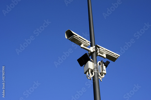 camera, surveillance, security, monitor, look, pole, blue skies, france, object, white, blue, black