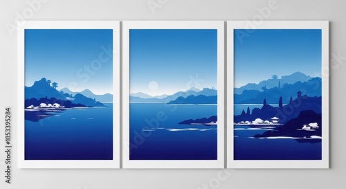 blue, landscape, triptych, art, water, hill, structure, monochromatic, nature, tranquil, serene, oriental, coastline, reflections, geometric, framed, decor, artwork, illustration, horizon, design, abstract, minimalist, scenic, picturesque, contemporary, graphic, modern, elegant, aesthetic, peaceful, calmness, stylised, simplicity, nautical, maritime, lakeshore, seascape, graphical, symmetric, gradient, shading, artistic, pristine