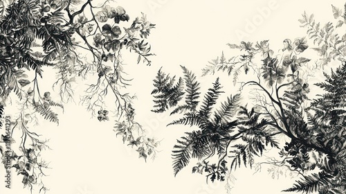 Monochrome Botanical Illustration Featuring Ferns and Flowers