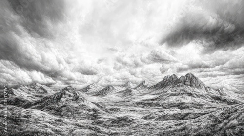 mountain, range, peak, hill, sky, cloud, stormy, weather, greyscale, monochrome, landscape, nature, scenic, view, dramatic, atmospheric, cloudscape, grey, white, black, textured, artistic, digital, art, illustration, painting, rendering, image, photo, graphic, design, background, abstract, cold, wind, winter, snow, frost, wilderness, huge, expanse, horizon, perspective, depth