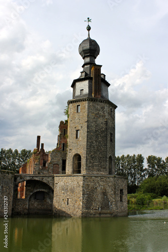 belgium, belgian, castle, walloon, landmark, architecture, duck pond, lake, exterior, outside, outdoors, water, ruin, ruin, ruined, village, town, city, abandoned, sky, island, place, church, bridge, mediaeval, fortress, bird, chapels, deserted, crack, negligence, travel, tour tourism, fort, walled, tower, onion, bulbous, dome, old
