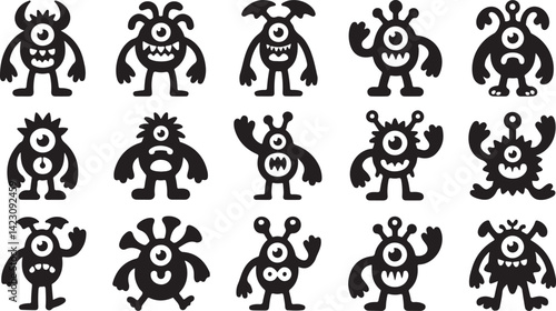 Monster Silhouette Vector Set with Creature Fantasy Icons in Black Minimal Style